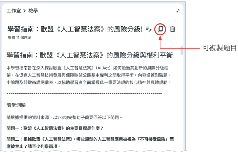 NotebookLM中已有內建3個功能,可以輔助蒐集潛在的考題,分別為「報告 - 學習指南」、「學習卡」、「測驗」。