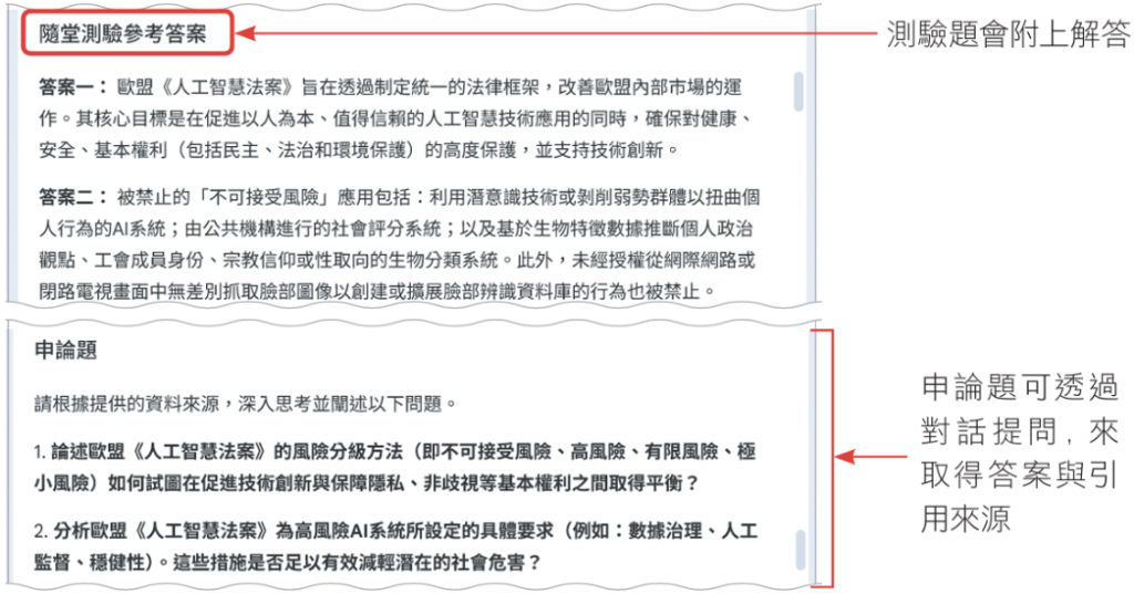 所以你可以把自己填答申論題的內容,作為一筆來源匯入到NotebookLM。進一步請它使用歐盟人工智慧法案檔案作為依據,來給予填答狀況的建議。