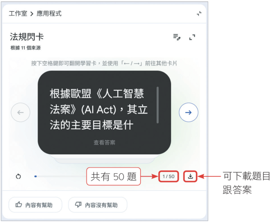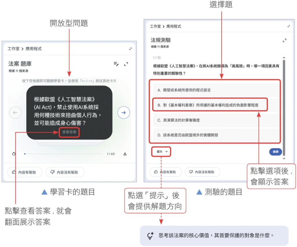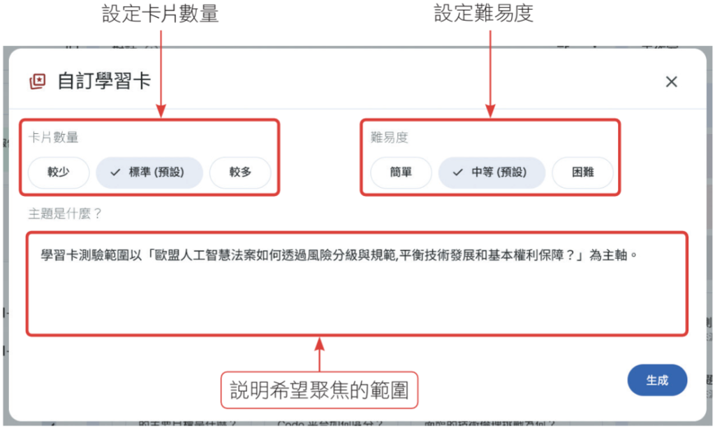 「學習卡」、「測驗」功能可以提供給你互動型態的測驗模式,你可以指定卡片數量、問題數量、難易度,並且能下指令,讓它依據你目前的需求來生成。