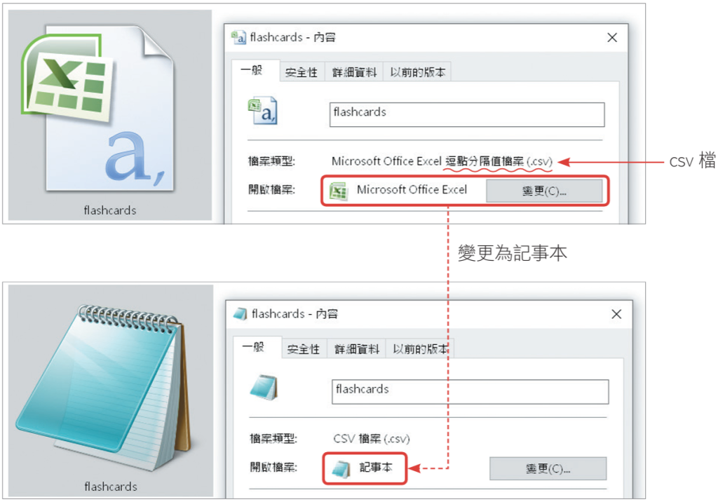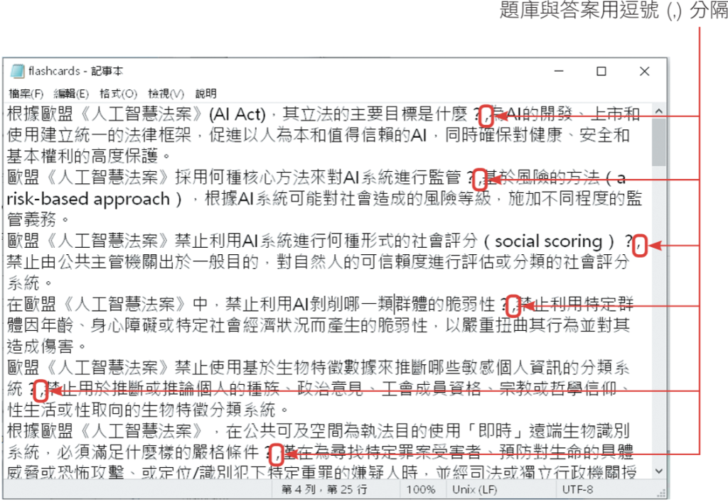 下載後,會是csv檔,如果直接用Excel開啟,很可能會出現一堆亂碼。建議你將預設開啟檔案類型變更為記事本,題庫跟答案就能正常顯示。(備註:有多種方法能讓Excel正常開啟csv檔,但此處的重點是取得正確文字內容,並匯入NotebookLM,因此不在此詳述。)