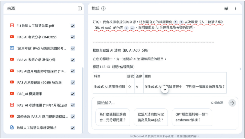 舉例來說,iPAS有提供AI應用規劃師能力鑑定的考試樣題,讓我們嘗試把這份檔案,匯入到NotebookLM中,並在問答面板提問。
