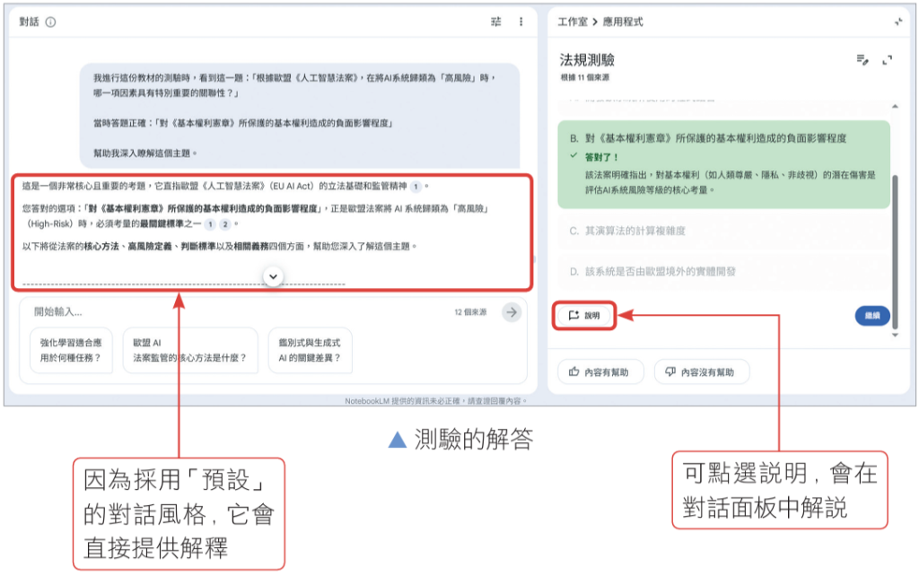 如果你希望在互動時,NotebookLM可以直接回答你問題,而不是一直追問你的學習狀態,可以把對話風格改回「預設」,或是自訂指令,讓它擔任一位解題專家。