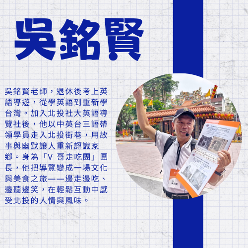 課堂氣氛在中英台三語切換自如的引導下,總是充滿笑聲與互動。除了文化深度,他的「美食哲學」更是吸引力之一。「我常說,吃飯、聊天、學文化,才是人生三部曲。」許多學員笑稱:「跟著 V 哥導覽,一定有好吃的、好笑的、好聽的!」吳銘賢老師更說道:「吃台灣米,喝台灣水,愛會曉講台語!」,這番純粹透徹的理念,也讓他成為學員心中最有溫度的導覽人。