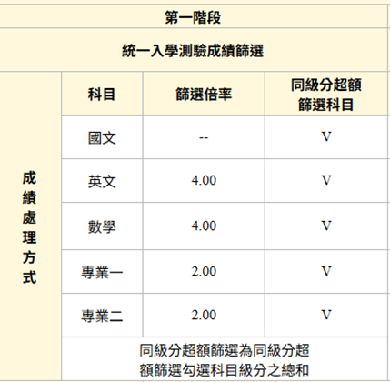 因招生名額為40人,因此會先選取同倍率的英文和數學最好的前160名(招生名額40名*4倍),接著再從160名中篩選專業一和專業二最好的前80名(招生名額40名*2倍),就是進入第二階段的考生。