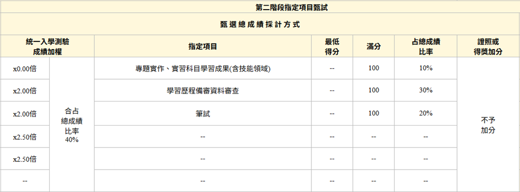 • 右側:顯示第一階段篩選方式與第二階段考試內容(面試、實作或學習歷程繳交等,各系不同,須注意各系官網公告)。