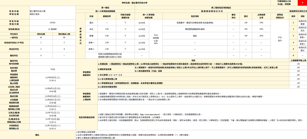 以臺科大機械工程學系為例,進入簡章頁面後會看到以下資訊: